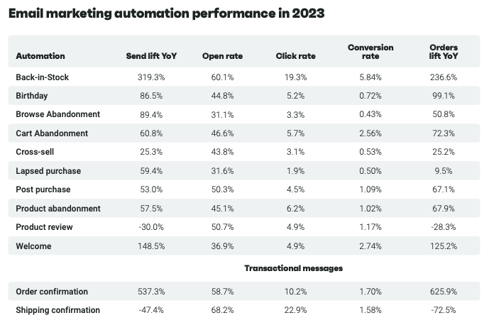 ** Automation is on the rise. Brands sent 78.7% more automated emails YoY. Compared to campaign emails, automated emails' open rate increased by 67.4%, the click rate increased by 259.2%, and the conversion rate increased by 2711%.