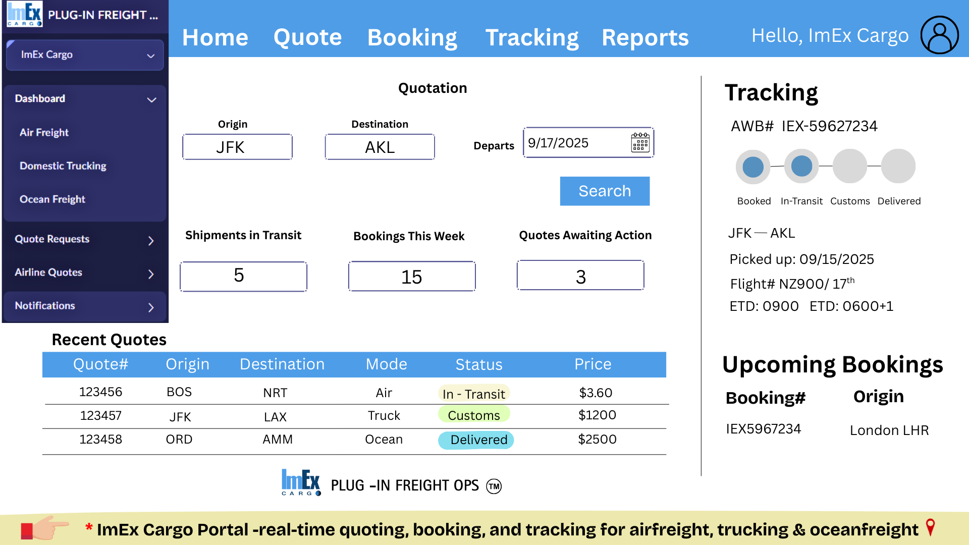 “ImEx Cargo Portal dashboard for quoting, booking, and cargo tracking.”
