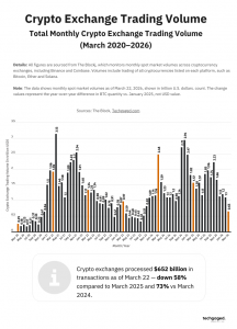 March has always been an unpredictable month for the crypto market, bringing either sharp corrections or strong rebounds, and this year was no exception. Although crypto exchange trading volume dipped sharply after the Q4 2025 market correction, it remained relatively stable between December and February, fluctuating between $1.1 trillion and $1.2 trillion. But that changed in March, with trading volumes hitting a multi-year low as cooling prices and fading retail interest, amid macroeconomic concerns, pushed traders to the sidelines.