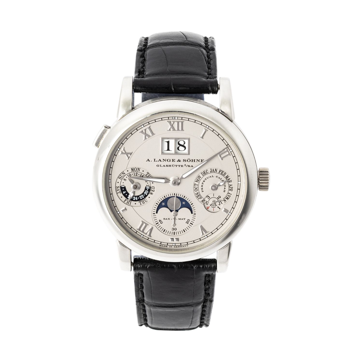 A. Lange & Söhne Ref. 310.025 Langematik Perpetual Calendar in platinum, featuring outsize date and moon phase. (CA$96,800)